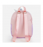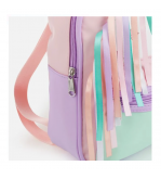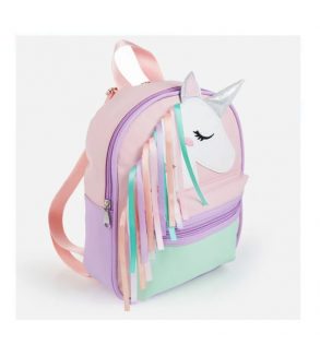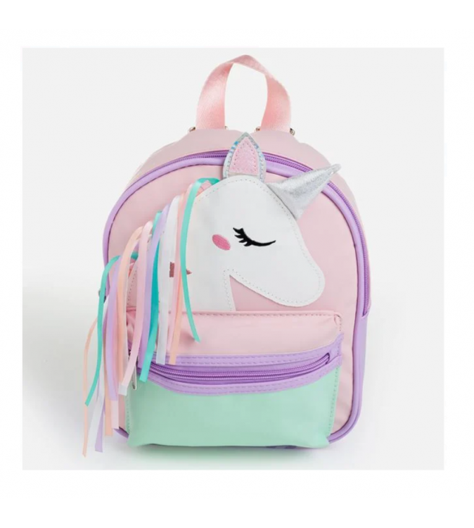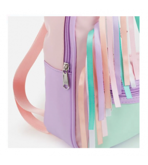 Rucsac pentru fete, de culoare roz, lila si verde, cu model 3D unicorn, franjuri si corn holografic argintiu. Dispune de un compartiment principal spatios si un buzunar frontal, se inchide cu fermoar lila, are maner si bretele roz reglabile.
