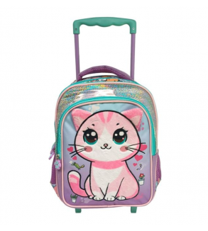 Ghiozdan tip troler pentru fete, cu 2 compartimente, un buzunar mare, 2 buzunare laterale din plasa pentru sticla, de culoare verde si lila, cu model pisica 3D din catifea, cu ochi mari. Are eticheta exterioara pe spate pentru datele copilului, fermoare rezistente, bretele reglabile si maner extensibil cu inaltime de pana la 61cm.