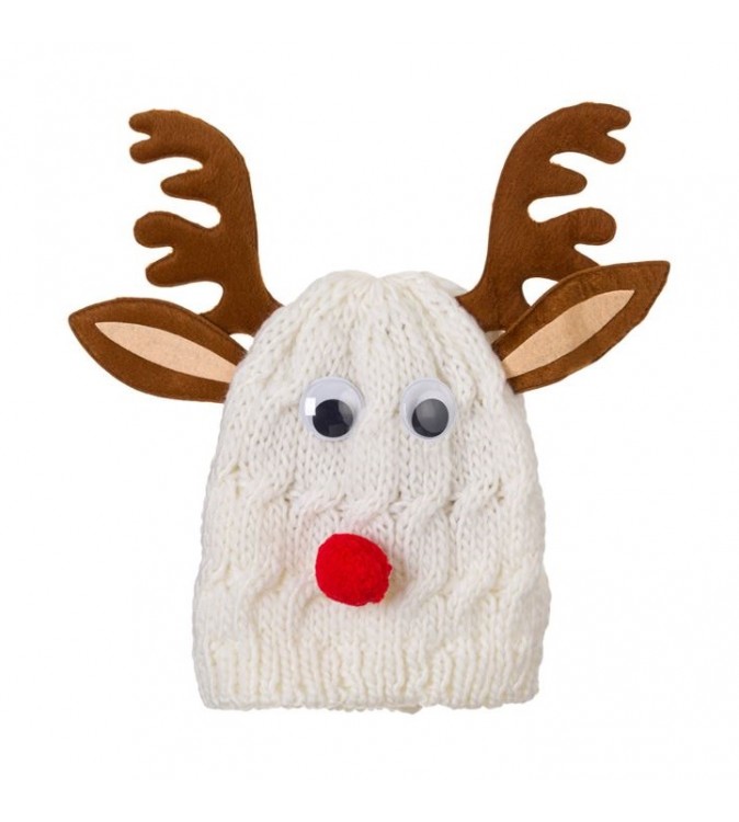 Caciula de craciun, alba impletita model cerb cu urechi, coarne, ochi si nas rosu.