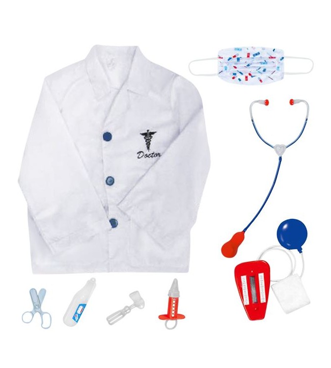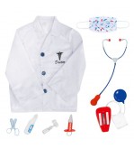Contine: uniforma de medic, masca, stetoscop si 6 instrumente medicale (ciocan, seringa, ipsos, etc.)