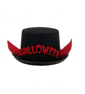 Palarie neagra pentru adulti cu coarne rosii si mesaj de Halloween.