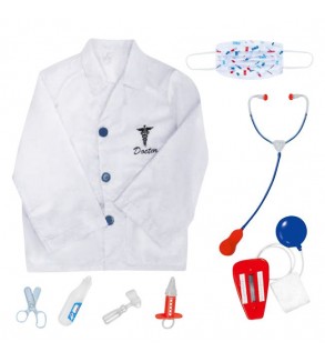 Contine: uniforma de medic, masca, stetoscop si 6 instrumente medicale (ciocan, seringa, ipsos, etc.)