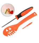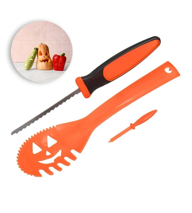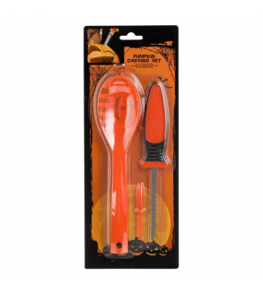 Kitul include un cutit zimtat pentru coaja tare a dovleacului, o lingura de plastic pentru a scoate pulpa dovleacului si un cutit mic de sculptat pentru detalii.