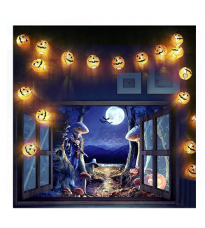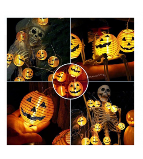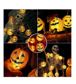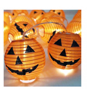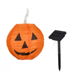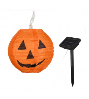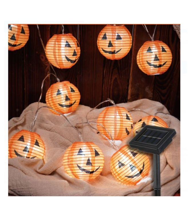 Ghirlanda de Halloween cu panou solar cu LED, cu 10 dovleci portocalii de Ø8cm cu lumina alba rece. Este ecologica. Cu buton Pornit/Oprit, contine o baterie reincarcabila.