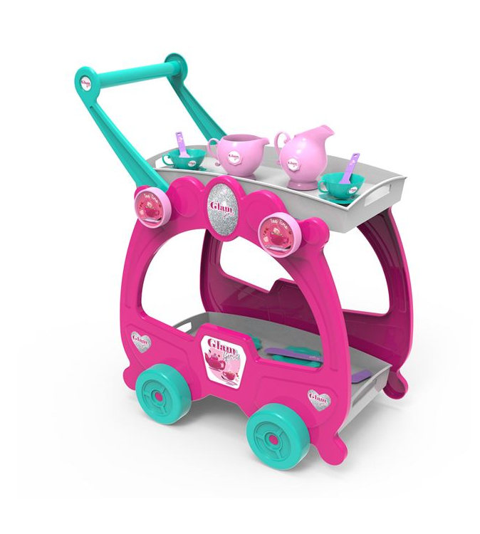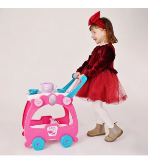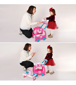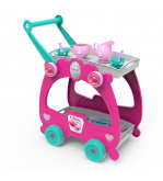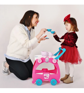 Masuta de cafea de jucarie de culoare fucsia cu detalii verzi si tava detasabila. Contine o multime de accesorii pentru servirea ceaiului sau a cafelei. Pentru ore nesfarsite de joaca.