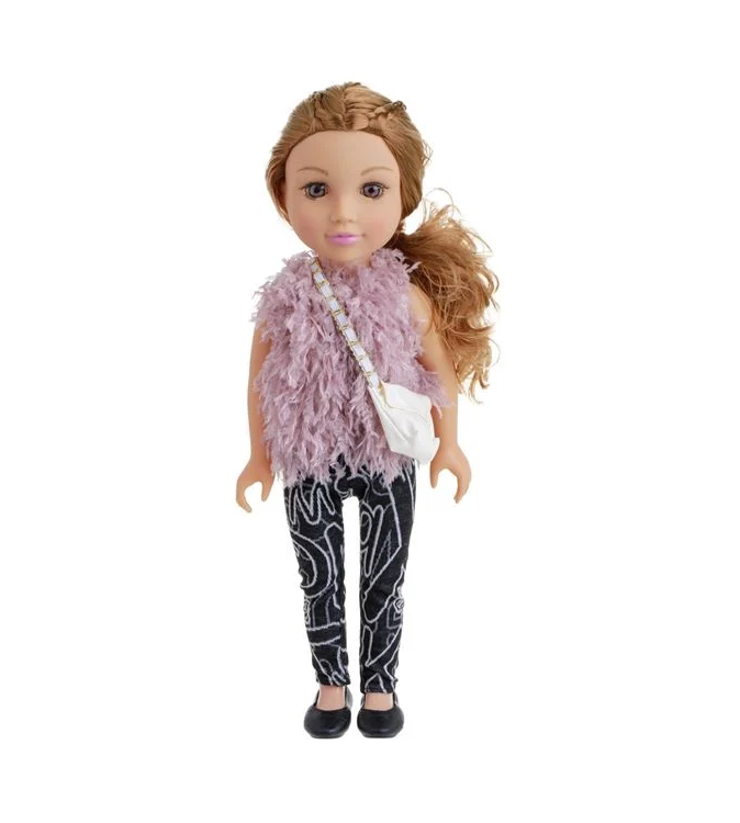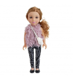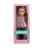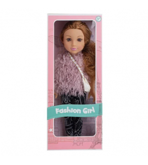 Papusa manechin, cu haina din imitatie de blana, colanti cu imprimeu si poseta.