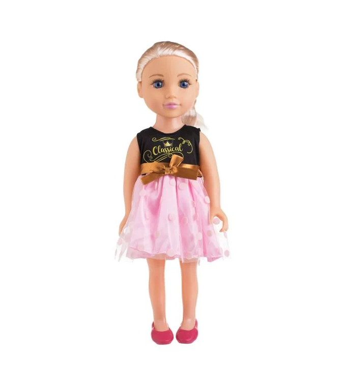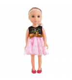 Papusa manechin cu outfit la moda cu rochie fara maneci cu fusta din tul roz si curea frumoasa.