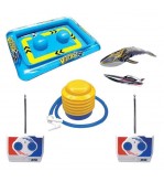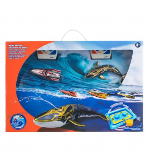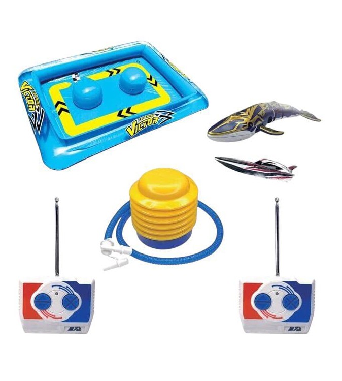 Set cu piscina gonflabila de 125x87 cm si barca rapida si balena controlate de la distanta pentru batalii epice in apa. Balena are un pulverizator de apa si capacitate de scufundare, iar barca rapida are un motor foarte puternic si o elice dubla. Barca functioneaza cu 1 baterie de tip 2,4V 50mAh (inclusa) si balena cu 1 baterie de tip 3,7V 90mAh (inclusa). Comenzile functioneaza cu 3 baterii AA (fiecare) (nu sunt incluse).