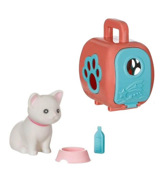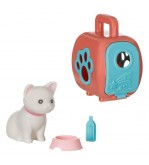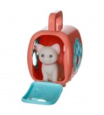 Transport pentru pisici in culoarea bleu cu model pe geam si usa. Impreuna cu un pisoi cu accesorii. Ia-ti pisicuta preferata la plimbare sau joaca-te pentru a-i tine companie.