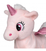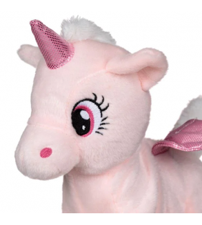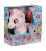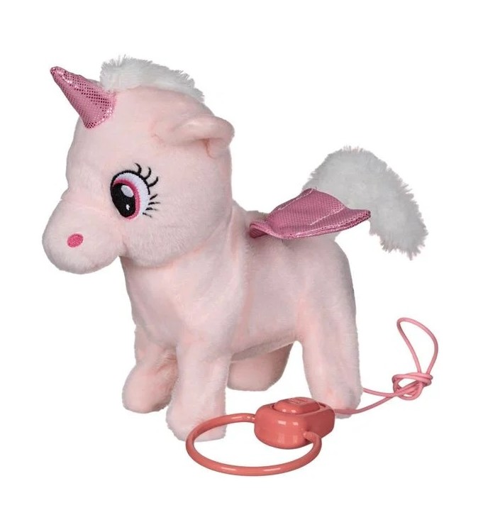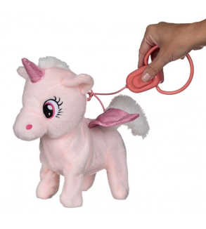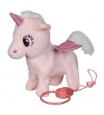 Unicorn mecanic roz cu curea de 80cm cu buton care misca coada, aprinde cornul si reda muzica. Are un buton de pornit/oprit. Vine cu bol de mancare si peste. Functioneaza cu 3 baterii AA (incluse demonstrativ).