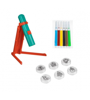 Proiector pentru desene de Craciun cu lanterna reglabila, 6 diapozitive si 6 carioci. Lentila de focalizare poate fi reglata la inaltimea dorita. Cu buton de pornire/oprire. Functioneaza cu 2 baterii AAA (nu sunt incluse).
