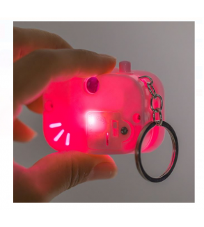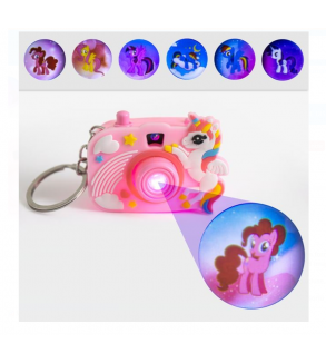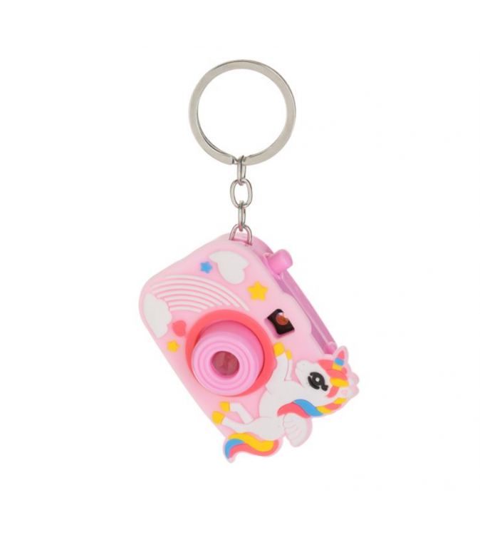 Breloc pentru copii, de culoare roz, in forma de aparat foto. Are model cu unicorn, lumina si buton care permite vizualizarea a 8 imagini dragalase cu unicorni sub forma de slide.