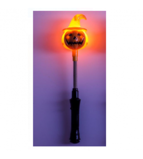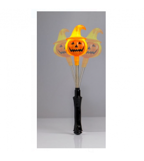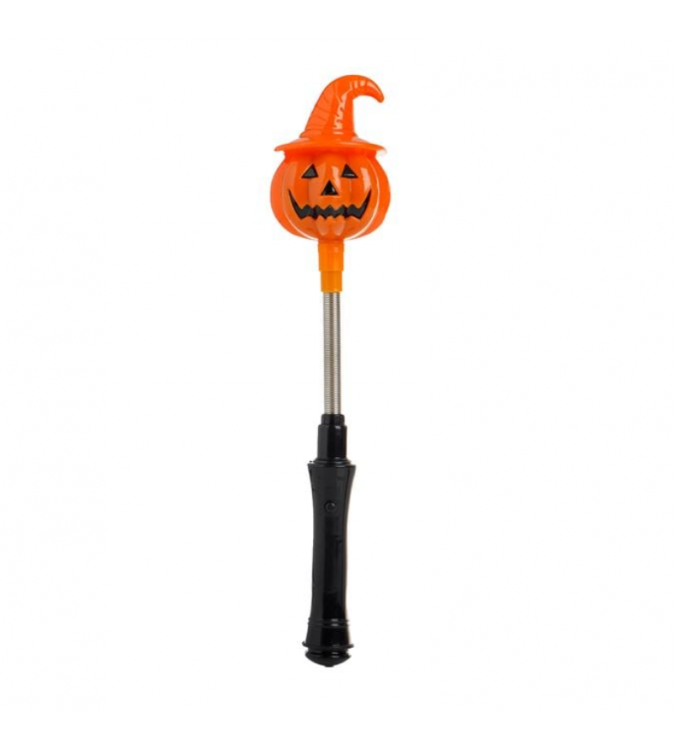 Bagheta de Halloween cu dovleac portocaliu sau negru, montat pe arc ce ii ofera miscare, si lumina interioara cu 3 functii de iluminare (schimbare rapida, schimbare lenta, lumina fixa). Functioneaza cu 3 baterii tip LR44 (incluse).