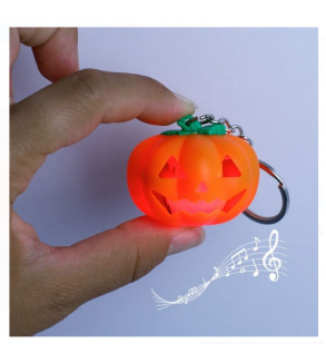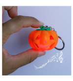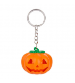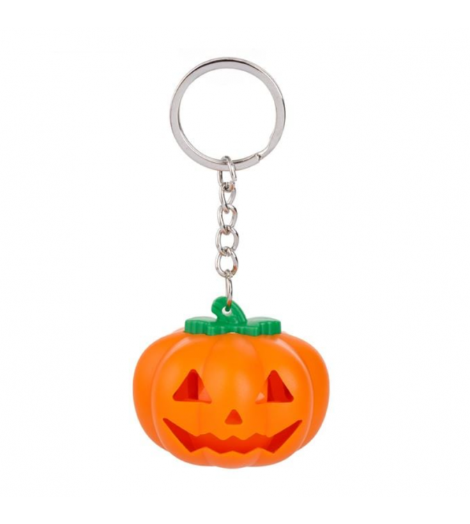 Breloc cu dovleac de Halloween, de culoare portocalie cu frunze verzi, cu sunet si lumina. Functioneaza cu 3 baterii tip AG10 (incluse). \