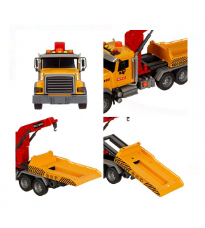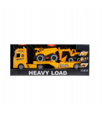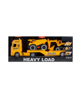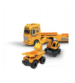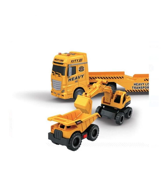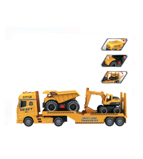 Camion care transporta 2 vehicule de constructii, un camion cu basculanta si un excavator cu brat mobil mic. Partea din spate a camionului coboara pentru a usura incarcarea si descarcarea vehiculelor. Camionul are sunete si lumini realiste, iar camionul basculant are sunet. Functioneaza cu 6 baterii de tip AG13 (3 pentru camionul mare si 3 pentru camionul basculant) (incluse).