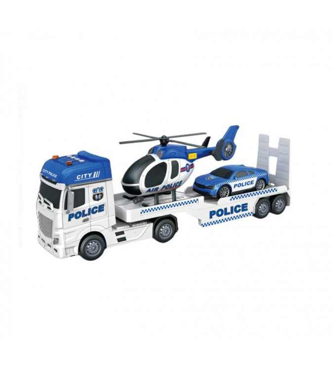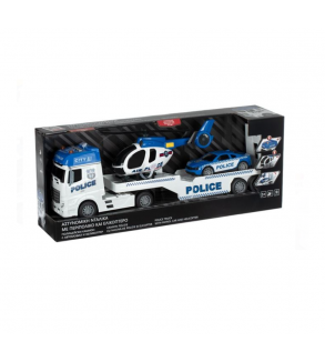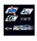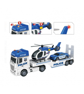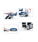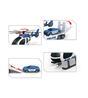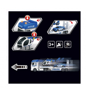 Camion de politie cu sunete de functionare si lumini cu remorca in care se afla un elicopter si o masina de politie. Rampa de pe remorca coboara pentru a descarca vehiculele. Elicopterul are sunete de zbor. Functioneaza cu 3 baterii LR44 pentru elicopter (neincluse) si 3 baterii LR44 pentru camion (neincluse).