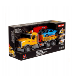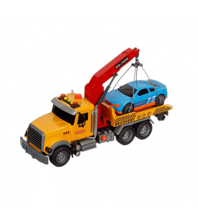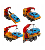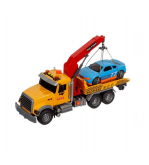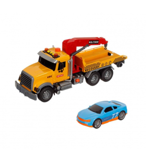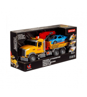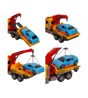 Jucarie pentru baieti, camion macara cu platforma si vehicul. Macaraua se poate ridica / cobora. Platforma se deplaseaza in spate si in jos. Are lumini si sunete de functionare realiste. Functioneaza cu 3 baterii AG3 (incluse).
