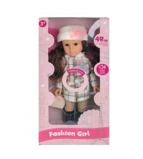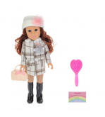 Papusa manechin cu pantaloni tricotati bej, cizme inalte negre si palton in carouri bej-maro. Poarta o poseta roz la moda, palarie ecru cu floare din tul roz si brosa in forma de inima roz. Include o perie pentru par si un pasaport pentru calatoriile ei. Functioneaza cu 3 baterii tip AG13 (incluse).