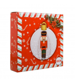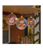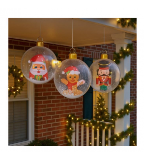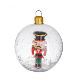 Decoratiune de Craciun minge tip glob gonflabil transparent cu figurina soldat de lemn in mijloc si zapada.