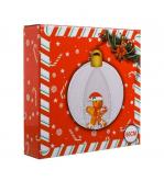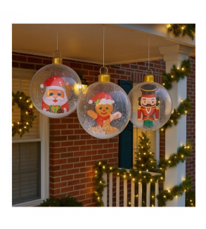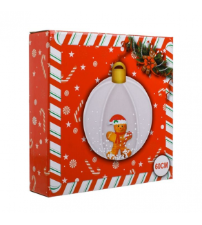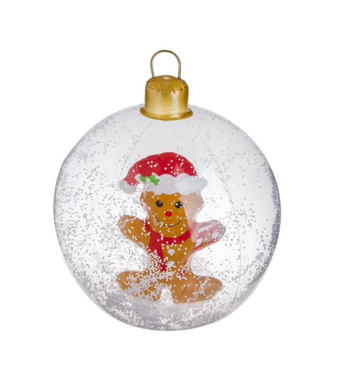 Decoratiune de Craciun minge tip glob gonflabil transparent cu figurina om de turta dulce in mijloc si zapada.