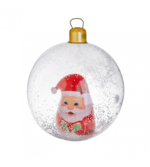 Decoratiune de Craciun minge tip glob gonflabil transparent cu figurina Mos Craciun in mijloc si zapada.