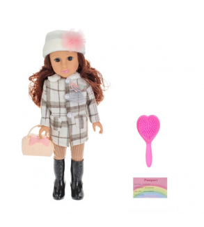 Papusa manechin cu pantaloni tricotati bej, cizme inalte negre si palton in carouri bej-maro. Poarta o poseta roz la moda, palarie ecru cu floare din tul roz si brosa in forma de inima roz. Include o perie pentru par si un pasaport pentru calatoriile ei. Functioneaza cu 3 baterii tip AG13 (incluse).