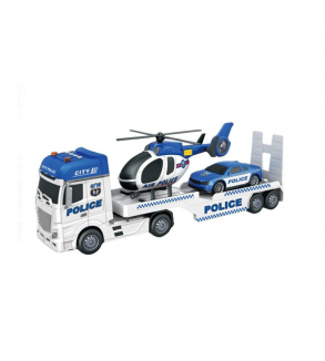 Camion de politie cu sunete de functionare si lumini cu remorca in care se afla un elicopter si o masina de politie. Rampa de pe remorca coboara pentru a descarca vehiculele. Elicopterul are sunete de zbor. Functioneaza cu 3 baterii LR44 pentru elicopter (neincluse) si 3 baterii LR44 pentru camion (neincluse).