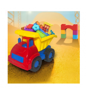 Camion cu bena rabatabila, de culoare rosie, galbena si albastra, cu roti mari negre. Contine 30 de caramizi colorate pentru constructii. Dupa joaca, caramizile pot fi depozitate in bena camionului.