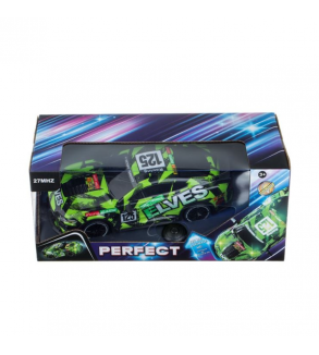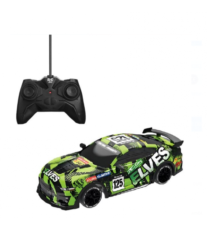 Masina de curse drift cu lumini, detalii verzi, aripa si roti negre.
