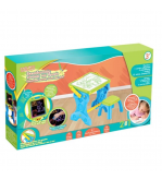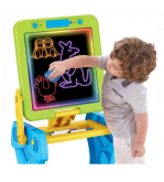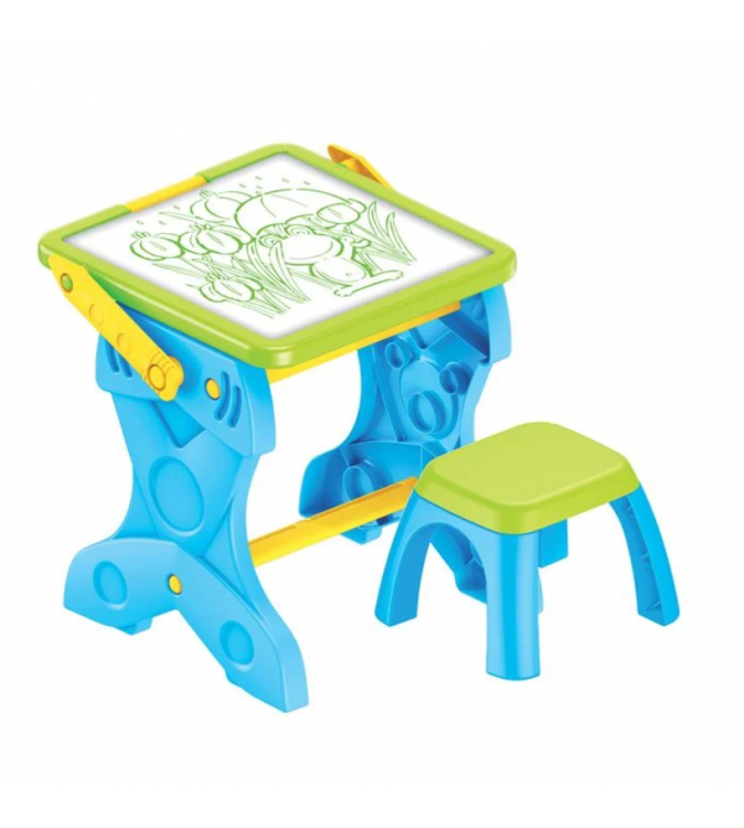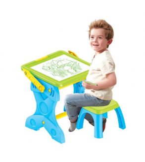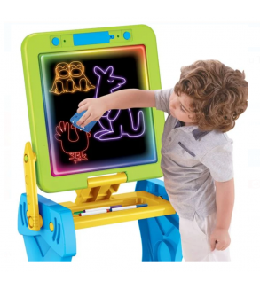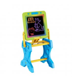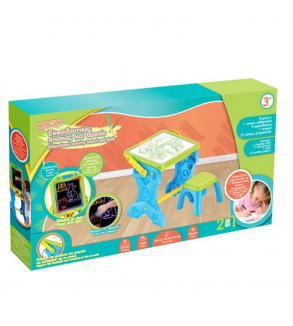 Birou educational cu suprafata pliabila care devine o tabla clasica de pictura, o tabla cu lumina, intrerupator si functie comutabila. Contine 4 markere si o carpa pentru curatarea tablei, 12 file de hartie daca copilul doreste sa deseneze pe hartie si un scaun - taburet. Tabla functioneaza cu 4 baterii AAA (nu sunt incluse).