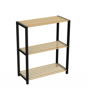 Etajera din lemn MDF, cu 3 rafturi 65x29cm. Cadrul este de culoare neagra, iar rafturile de culoare naturala. Este ideala pentru baie, bucatarie, living, sufragerie, dormitor sau birou.