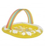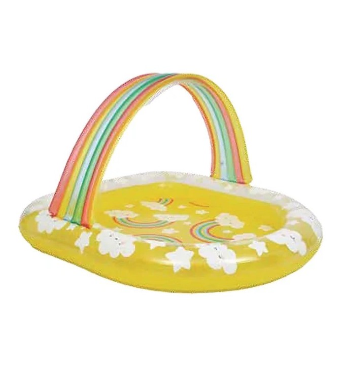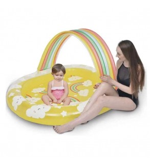 Piscina pentru copii, de culoare galbena cu model girafa curcubeu, acoperita pentru a proteja copilul de soare. Cu baza moale si gonflabila. Petic de reparatie inclus.