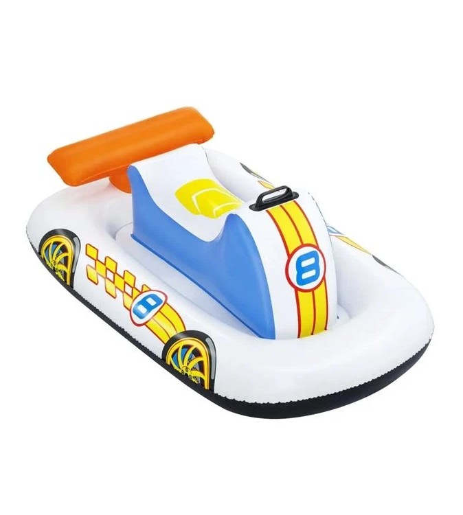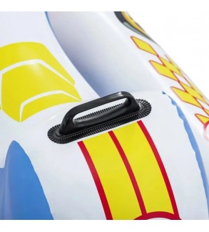 Saltea gonflabila in forma de jet ski cu model masini de curse si maner rezistent. Contine petic de reparatii. Ideal pentru joaca la plaja sau in piscina.