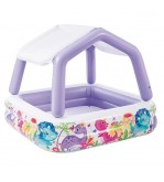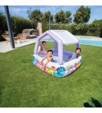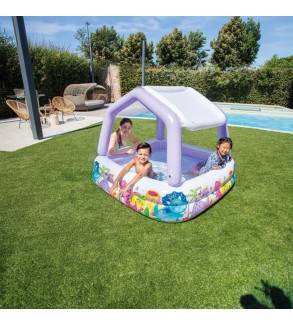 Piscina pentru copii, de culoare bleu, cu model pestisor, acoperita pentru a proteja copilul de soare. Cu baza moale si gonflabila. Petic de reparatie inclus.