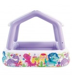 Piscina pentru copii, de culoare galbena cu model nor si curcubeu, acoperita pentru a proteja copilul de soare. Cu baza moale si gonflabila. Petic de reparatie inclus.
