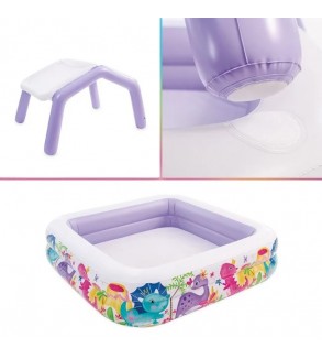 Este confectionata din vinil, compusa din 2 inele gonflabile, cu imprimeu vesel. Dimensiunile piscinei sunt 157 x 157 x 122 cm. Cantitatea de apa necesara umplerii (80%) este de 295 l.