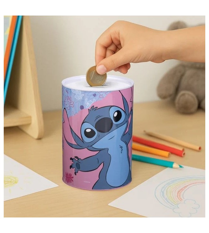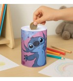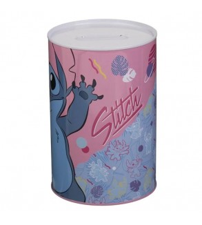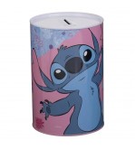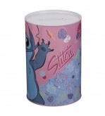 Pusculita metalica cilindrica cu model Stitch de culoare roz lila. Pusculita nu are capac.