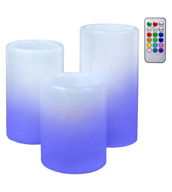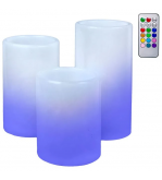 Set lumanari decorative cu LED, operate cu baterii cu margine ondulata. Cu telecomanda si flacara cu 12 culori diferite la alegere. Functioneaza cu 2 baterii AA (neincluse). Cu buton Pornit/Oprit.